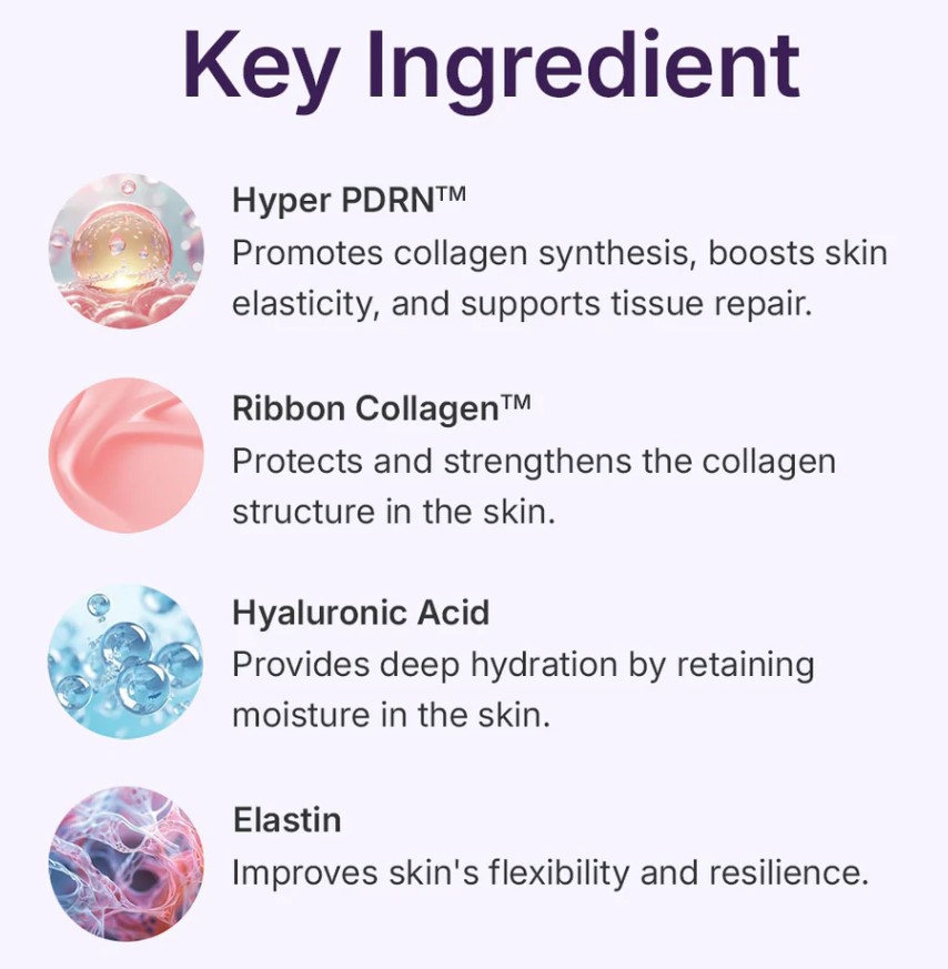 Βοηθά στην ανόρθωση και σύσφιξη έξι βασικών περιοχών που επηρεάζονται από τη γήρανση (μέτωπο, περιοχή των ματιών, μάγουλα, περιοχή του στόματος, ρινοχειλικές πτυχές, κάτω από το πηγούνι), προσφέροντας ένα σφριγηλό, τρισδιάστατο αποτέλεσμα ανόρθωσης για το πρόσωπο. Συνιστάται για το δέρμα σε περιοχές που είναι χαλαρές λόγω γήρανσης (μέτωπο, περιοχή γύρω από τα μάτια, μάγουλα, περιοχή γύρω από το στόμα και κάτω από το πηγούνι).Με Hyper PDRN και Ribbon Collagen, ένα πολυεπίπεδο ελαστικό φράγμα με μία μόνο χρήση: Μία εφαρμογή βελτιώνει την ελαστικότητα έως και 10 στιβάδες του δέρματος και παρέχει 24ωρη σταθερότητα, ενώ παράλληλα βοηθά στην αποκατάσταση του κατεστραμμένου δερματικού φραγμού για πιο σφριγηλό και υγιές δέρμα.Ειδικά συστατικά για μεγιστοποίηση της συνέργειας αναζωογόνησης! Περιλαμβάνονται κολλαγόνο, ελαστίνη, υαλουρονικό οξύ, No9ble Berry, Purplower, εκχύλισμα Tillandsia Usneoides και εκχύλισμα Gynostemma.