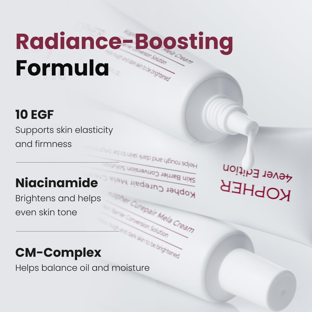 Η Curepair Mela Cream περιέχει ακόμη 74% φυσικά εκχυλίσματα, όπως άνθη Matricaria και άνθη αγιοκλήματος, νιασιναμίδη , NCTF Complex για ενυδάτωση & αντιγήρανση καθώς και CNP Ceramides για την ενίσχυση του επιδερμικού φραγμού. Υποαλλεργικό, κατάλληλο για ευαίσθητες επιδερμίδες και ασφαλές για ακνεϊκά δέρματα.